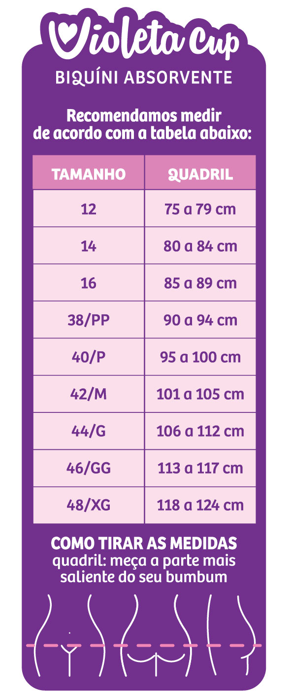 Para garantir o máximo conforto, recomendamos escolher um tamanho maior caso seu quadril e bumbum sejam mais volumosos ou se suas medidas estiverem no limite de um tamanho específico.